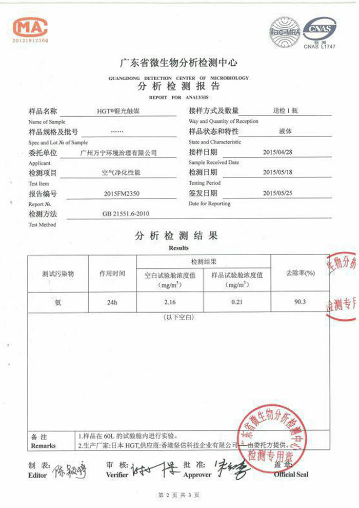 • 中國廣州分析測試中心甲醛分解測試報告